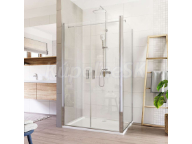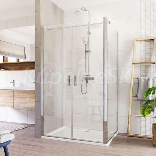 Hliníkové profily vo farbe chróm, lietacie dvere a pevný diel, sklo Číre, sila skla 6 mm, obdĺžnik, 1000 (dvere) x 900 (pevný diel), výška 1900 mm.