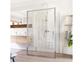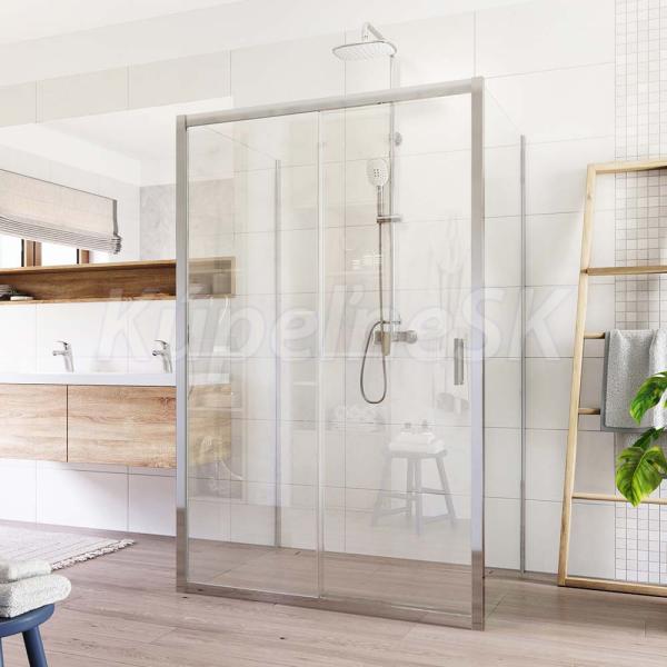 Hliníkové profily vo farbe chróm, zasúvacie dvere a dva pevné diely, sklo Číre, sila skla 6 mm, obdĺžnik, rozmer 800x1100x800 mm, výška 1900 mm.