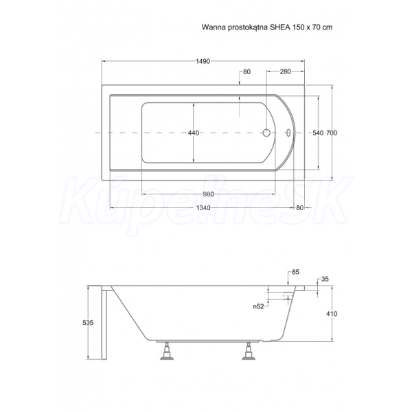 Besco SHEA Vaňa obdĺžniková akrylátová 150x70cm, 165 l, Biela
