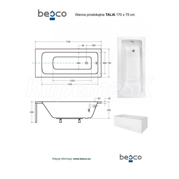 Besco TALIA Vaňa obdĺžniková akrylátová 170x75cm, 190 l, Biela a nohy