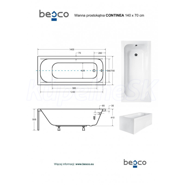 Besco CONTINEA Vaňa obdĺžniková akrylátová 140x70cm, 170 l, Biela