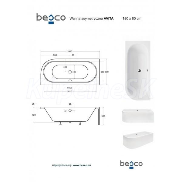 Besco AVITA Vaňa asymetrická akrylátová 180x80cm Pravá 217 l, Biela