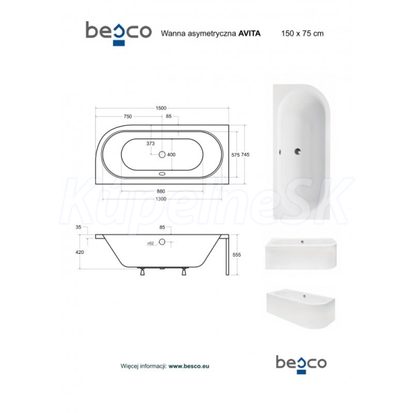 >>  Vane + príslušenstvo  >>  Akrylátové-Rohové asymetrické vane  >>  Besco AVITA Vaňa asymetrická akrylátová 150x75cm Ľavá 150 l, Biela + nohy