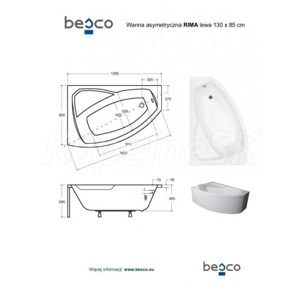 Besco RIMA Vaňa asymetrická akrylátová 130x85cm Ľavá 135 l, Biela