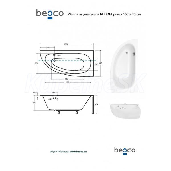 Besco MILENA Vaňa asymetrická akrylátová 150x70cm Pravá 140 l, Biela + nohy