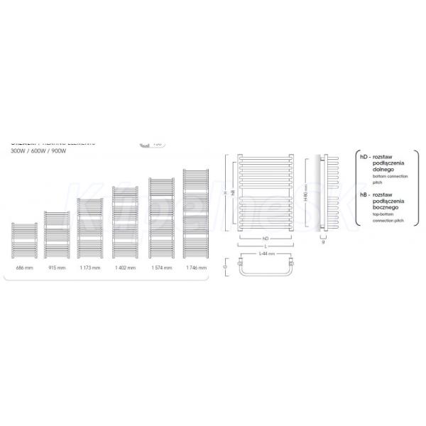 - 300 × 915 mm (bočné pripojenie), výkon 400 W (vykurovacia tyč 400 W)
