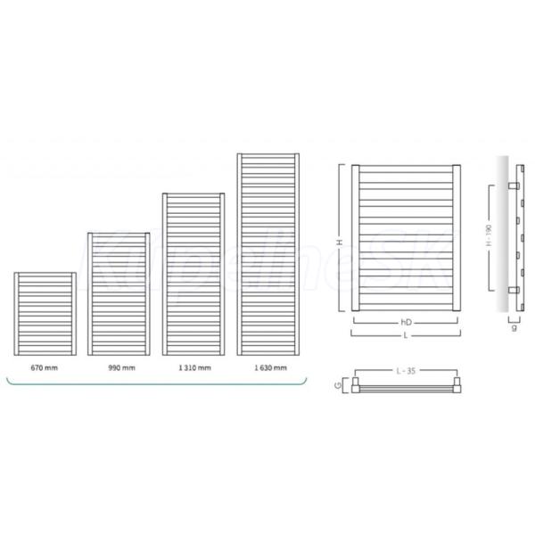 - 600 × 1 630 mm, výkon 774 W, (vykurovacia tyč 900 W)