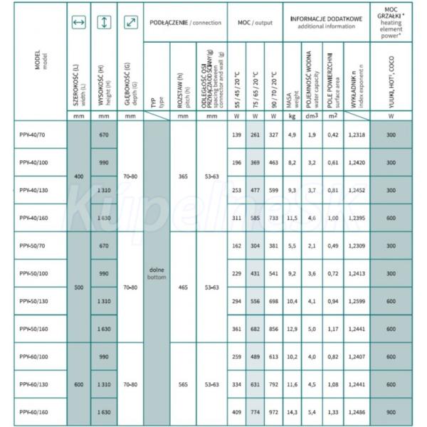 - 600 × 990 mm, výkon 489 W, (vykurovacia tyč 400 W)
