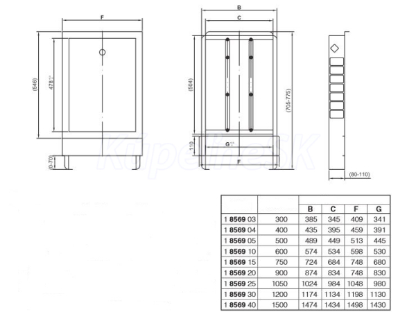 Určená pre montáž do steny, vyrobená z oceľového pozinkovaného plechu, predné dvere a rám sú lakované na bielo (RAL 9003). Nastaviteľná montážna hĺbka (80-110 mm), výška skrinky (705-775 mm), upínacia lišta pre držiaky rozdeľovača ako aj predný kryt.