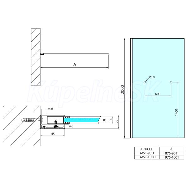 Polysan MODULAR SHOWER Walk-in stena na inštal. na múr,100 cm s otvormi na držiak,1x vzper