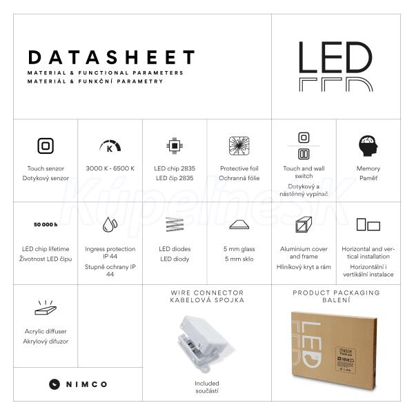 Koupelnové podsvícené LED zrcadlo. Příkon 32 W. Možnost nastavení barevné teploty od 3000 - 6500 K. 2304 Lumen.