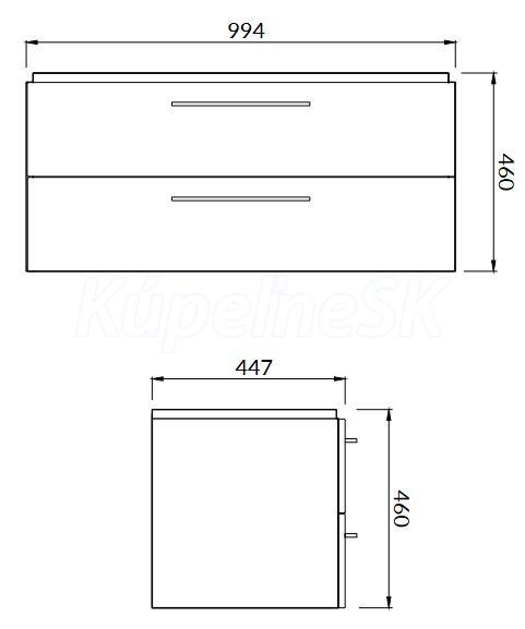 Závesná skrinka v lesklom prevedení s dvoma zásuvnakmi so systémom mäkkého zatvárania, je doplnená chrómovými madlami