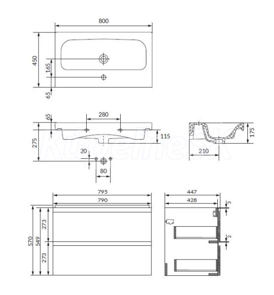 Súprava obsahuje umývadlovú skrinku MODUO vo verzii na vlastnú montáž s umývadlom MODUO 80. Predná časť skrinky je vyrobená z MDF dosky, lakovaná v antracitovej farbe. Skrinka má pohodlné frézované úchytky a systém tichého zatvárania dvierok.