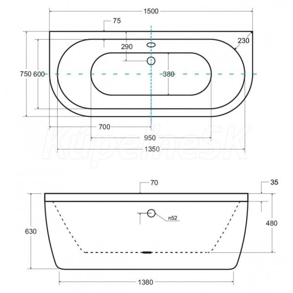 Vaňa je určená na montáž k priebežnej stene dlhšou stranou.