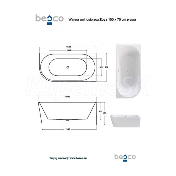 Besco ZOYA Glam voľne stojaca akrylátová vaňa 150x75cm,Grafit,sifón click-clack Biely,Prav