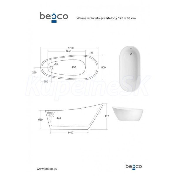 Besco MELODY Glam voľne stojaca akrylátová vaňa 170x80 cm,Grafit,sifón click-clack Grafit