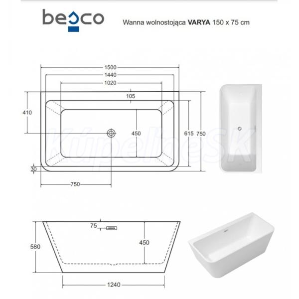 Besco VARYA Glam voľne stojaca akrylátová vaňa 150x75 cm,Strieborná,sifón click-clack Chró