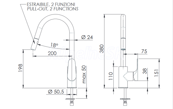 - Vlastnosti: otočná, 2-funkčná výsuvná sprcha