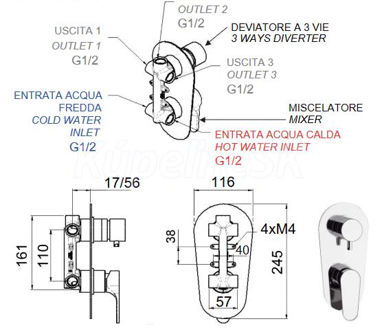 - Sprchová batéria podomietková, bez príslušenstva, s prepínačom, 3 výstupy