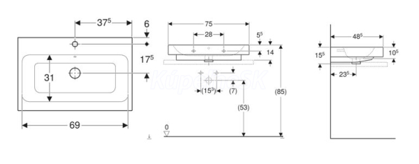 Umývadlo na dosku Geberit iCon: 75x48.5cm, Otvor pre batériu=V strede, Prepad=Viditeľné, Biela