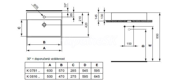 Ideal Standard K081601 STRADA Umývadlo na Dosku 50x42 cm,prepad,otvor pre batériu, Biela