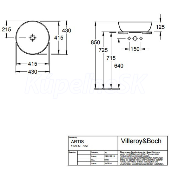 Villeroy & Boch Artis Umyvadlo k postavení na desku Kulatá, pro nástěnnou armaturu nebo armaturu se zvýšeným tělem, bez plochy pro otvor pro armaturu, bez přepadu Bílá Alpin CeramicPlus