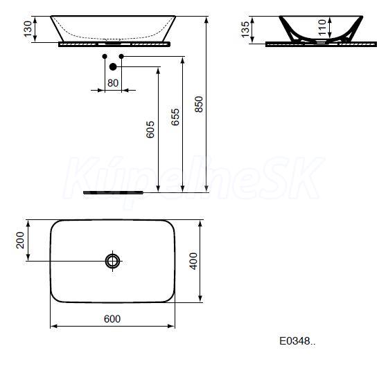 Ideal Standard E0348MA CONNECT AIR Umývadlo na dosku 60x40cm,Úprava Ideal Plus,Bez prepadu
