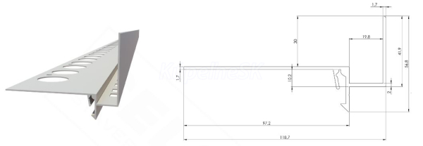 >>  Obklady a Dlažby - Stavebné lepidlá  >>  Lišty a Profily k obkladom dlažbám  >>  Dištančné lišty a profily pre suchú pokládku  >>  Celox Hliníkový Odkvapový/Balkónový profil RT+ ukončovací pr dlažbu v.30mm SvetloŠedý 2,5m