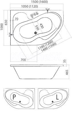 Akrylátová asymetrická vaňa Sanipro TULLIP, pravá 150x100cm/200L. Inštalačný rozmer: 150x100cm, dodávaná bez nôh.