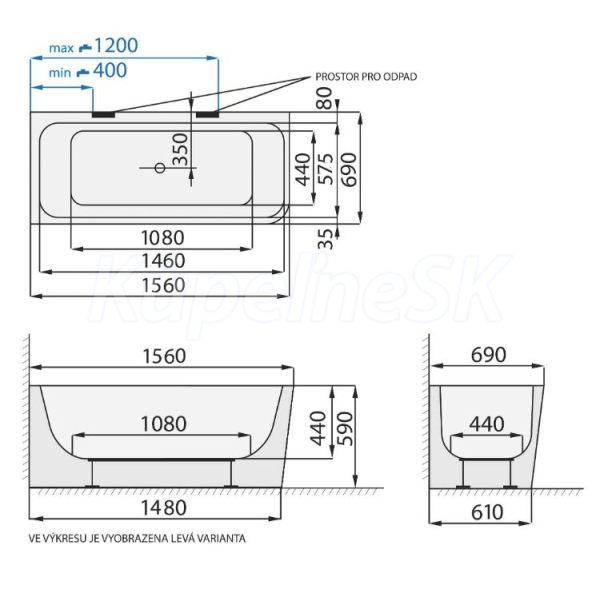 Voľne stojaca vaňa do priestoru TIME MILO - L (P) sa napája na odpad pomocou flexi odpadovej hadice HT DN 50.