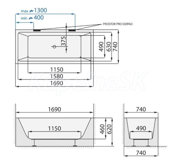Vzhľadom k užšiemu okraji vane odporúčame objednať odtokový komplet CLICK-CLACK. V prípade požiadavky na odtokový komplet s napúšťaním je nutné zvoliť takú výpust, ktorá nebude presahovať vonkajší rozmer vane.