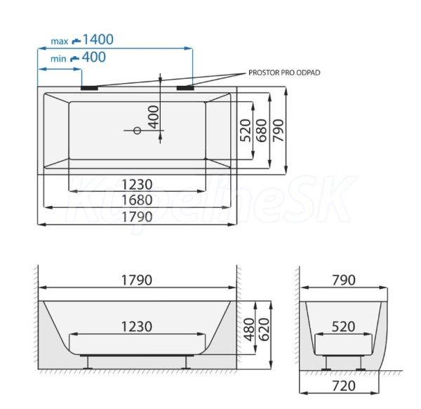 Vzhľadom k užšiemu okraji vane odporúčame objednať odtokový komplet CLICK-CLACK. V prípade požiadavky na odtokový komplet s napúšťaním je nutné zvoliť takú výpust, ktorá nebude presahovať vonkajší rozmer vane.