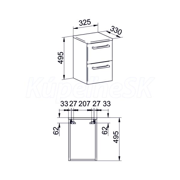 Zákazková výroba, Bino, kúpeľňová skrinka, spodná 325x495x330 mm, závesná, 2 zásuvky, Multidecor, Biela vysoký lesk perlička