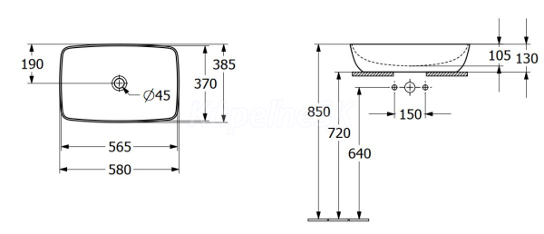 Villeroy & Boch Artis Umyvadlo k postavení na desku 580x380 obdélník, pro nástěnnou armaturu nebo armaturu se zvýšeným tělem, bez plochy pro otvor pro armaturu, bez přepadu Stone White CeramicPlus