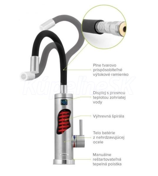 ZÁKLADNÉ VLASTNOSTI flexibilné tvarovo prispôsobiteľné výtokové ramienko telo batérie vyrobené z nehrdzavejúcej ocele pripojenie k elektrickej zásuvke nad drez, alebo pod drez displej s presnou teplotou zohriatej vody tepelná ochrana proti prepáleniu výhrevnej špirály, pri havarijnom stave bez nutnosti rozobratia batérie aktívny perlátor, ktorý spoľahlivo funguje tak pri malom ako aj plnom prietoku vody kompaktný dizajn, ohrievač aj batéria v jednom bezproblémová montáž na prívod studenej vody POPIS VÝROBKU Hlavnou prednosťou elektrickej priamoohrevnej batérii HAKL OB 500 je flexibilné tvarovateľné výtokové ramienko. Táto praktická vlastnosť umožňuje prispôsobenie vzdialenosti výtoku vody pri umývaní riadu. Telo batérie vyrobené z nehrdzavejúcej ocele spolu s opakovane reštartovateľnou tepelnou poistkou (pri havarijnom stave bez nutnosti rozobratia batérie), dodávajú výrobku výraznú odolnosť. Užívateľský komfort umocňuje zónový aktívny perlátor, ktorý automaticky uzatvára priechodnosť kanálikov v závislosti od množstva pretečenej vody. OHRIEVAČ VODY A VODOVODNÁ BATÉRIA V JEDNOM Zabezpečiť teplú vodu nie je vždy ľahké a preto firma HAKL uviedla na trh výrobok 2 v 1 – ohrievač vody a zároveň aj vodovodnú batériu . Výkon výhrevnej špirály (3,3 kW) postačuje pre bežné umytie rúk, riadu a drobných vecí v domácnosti. Priamoohrevnú batériu HAKL OB 500 stačí pripojiť iba na prívod studenej vody a do elektrickej siete pomocou zástrčky. FLEXIBILNÉ VÝTOKOVÉ RAMIENKO Povrch ramienka je vyrobený z kvalitnej odolnej neoprénovej peny, okrem estetického vzhľadu má aj dobré izolačné vlastnosti, pri manipulácii s ramienkom sa nepopálite. PERLÁTOR - ÚSPORA VODY Funkcia perlátora – usmerňovača vody je veľmi dôležitá. Dokáže aj pri veľmi nízkom prietoku vytvoriť dostatočný objem vody, vodu „naperlí“ a opticky zväčší jej prietok. Pri štandardne dodávanom perlátore je úspora vody až cca 70%. V ponuke má výrobca aj perlátor s väčším prietokom, kde je dosiahnutá úspora cca 50%. Tento perlátor sa odporúča zakúpiť, v prípade, že priamoohrevná batéria je nainštalovaná do vodovodného systému s vyšším tlakom vody. REŠTARTOVATEĽNÁ TEPELNÁ POISTKA V prípade havarijného stavu (napr. vzduch vo vodovodnom potrubí), tepelná poistka preruší elektrický prívod a ochráni tak výhrevnú špirálu od prepálenia. Tepelnú poistku nie je potrebné v servise vymeniť, stačí ju manuálne vrátiť do prevádzkového stavu. UNIVERZÁLNE PRIPOJENIE NAD DREZ A POD DREZ Priamoohrevnú batériu HAKL OB 500 je možné pripojiť k elektrickej sieti nad alebo pod drez bez potreby demontáže prívodného káblu. Stačí iba zmeniť montážnu redukciu, ktorá je súčasťou balenia. TABUĽKA VHODNOSTI POUŽITIA Pre jednoduchší výber vhodného modelu prietokového ohrievača vody výrobca pripravil prehľadnú tabuľku vhodnosti použitia. Zoradená je podľa príkonu a typu využitia - náročnosti na spotrebu množstva vody. Elektrické prietokové ohrievače vody aj napriek vyšším príkonom dosahujú vysokú finančnú úsporu, vzhľadom k tomu, že nemajú zabudovaný zásobník. Na rozdiel od zásobníkových ohrievačov zohrejú neobmedzené množstvo vody. Vodu zohrievajú priebežne, čo znamená, že zvyšovaním prietoku sa znižuje teplota ohriatej vody. Pri výbere prietokového ohrievača je nutné brať ohľad na spôsob využitia. Napríklad pri sprchovaní je nutné zohriať až trojnásobné množstvo vody ako pri umytí rúk, preto je potrebné zvoliť správny príkon prietokového ohrievača vody . Poznámka: Hodnoty v tabuľke sú orientačné, päť symbolov ••••• určuje maximálnu vhodnosť použitia, symbol x určuje nevhodnosť výrobku. Jednoduchý výber modelov ohrievačov vody podľa príkonu je možné zvoliť v hlavnej kategórii pomocou filtračného nástroja. Poznámka: Hodnoty PARAMETROV boli namerané pri: - sieťovom napätí 228 − 230 V - dynamickom tlaku vody 0,3 MPa (3 bar) - teplote vstupnej vody 12°C