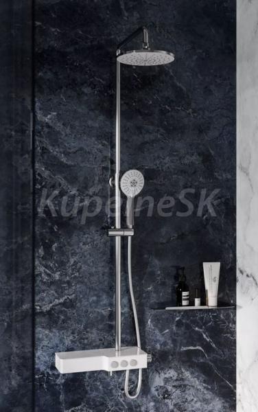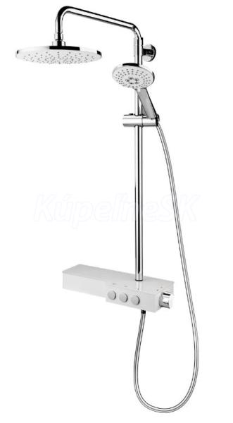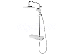 Veľkolepé proporcie, nádherné pochrómovanie, dizajn na najvyššej úrovni - tak možno charakterizovať tento elegantný sprchový systém. Zaoblený tvar dažďovej sprchy a sprchovej rukoväte v kombinácii so zaujímavým tvarom telesa vytvárajú originálny sprchový set pre našu kúpeľňu. Teleso, ktorého horná plocha je z tvrdeného skla, môže slúžiť ako polička na kozmetiku. Batéria má prepínače funkcií v podobe tlačidiel. V spodnej časti telesa sa nachádza ďalší vývod vody, vďaka ktorému môžeme napustiť sprchovú vaničku, detskú vaničku alebo misku. Systém bude dokonalou ozdobou sprchového kúta v prepracovanom dizajne.