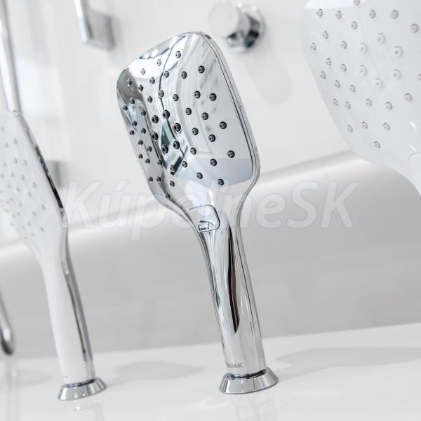 Ručná sprcha disponuje tromi funkciami intenzity prietoku vody. Režim prietoku Rain pripomína letný dážď a pôsobí na upokojenie pokožky. Pomocou funkcie Jet dosiahnete silný prietok zo stredu sprchy, ktorý intenzívne prekrví pokožku. Vhodný je aj pre čistenie menej dostupných miest v kúpeľni. Tretia funkcia ponúka kombináciu oboch týchto prietokov. Stlačením páčky je možné držiak ručnej sprchy presunúť jednou rukou do ľubovoľnej polohy a prispôsobiť aj jeho naklonenie. Hadica vyrobená z odolného plastu je účinne chránená proti poškriabaniu a vďaka systému EasyTwist sa vám nikdy neprekrúti. Balenie obsahuje segment pre vyrovnanie nerovnosti steny až o 50 mm.