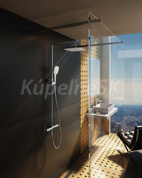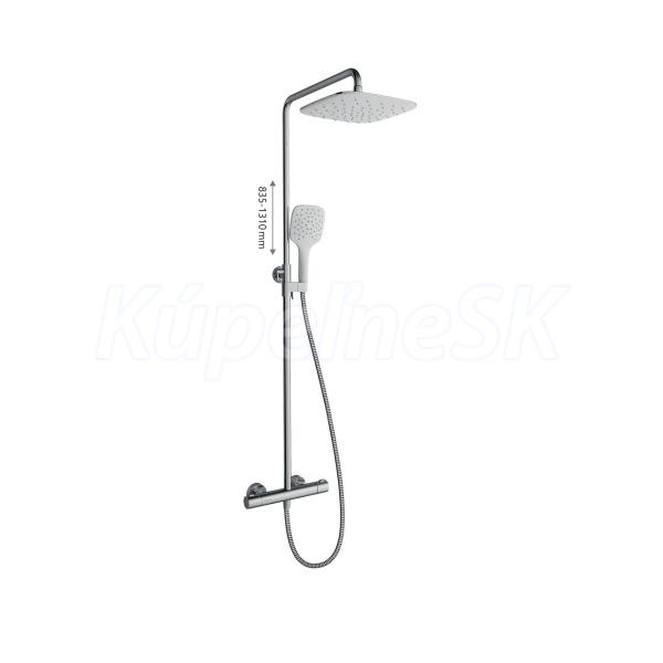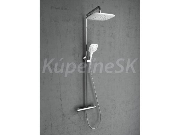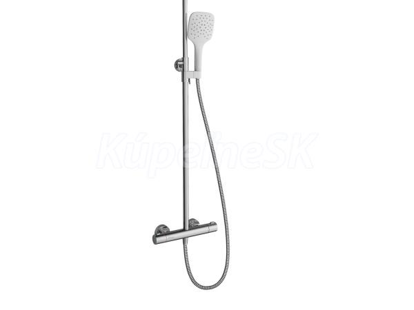 Sprchový stĺp Termo, posuvný, so sprchovým setom. Vo vyhotovení lesklý chróm s bielou hlavovou sprchou. Nastavenie stálej teploty vody.