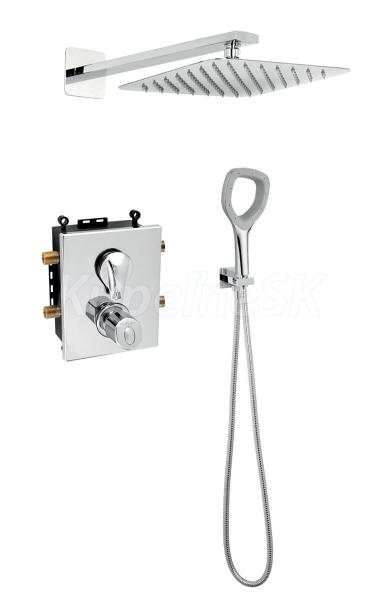 kategória distribúcie Novaservis: Sprchový program | Sprchové sety. Termostatická sprchová podomietková sada s príslušenstvom. Box je dodávaný spolu s krytom páky a prepínača. Sada obsahuje podomietkovú sprchovú batériu s termostatickou kartušou KEROX . so 7 ročnou zárukou. , hadicu 150 cm, hlavovú sprchu v rozmere 250x250 mm, úspornú ručnú sprchu a hranatý stenový vývod vody s držiakom na ručnú sprchu.