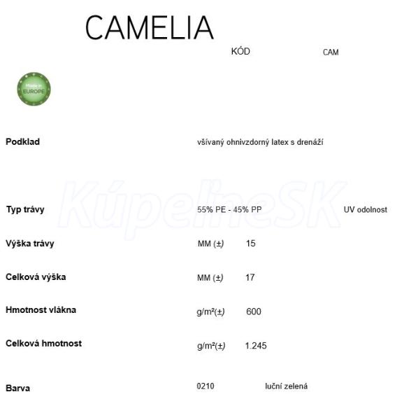 Umelý trávník Camelia je vďaka svojej hustote príjemný na došlap a je tak vhodný pre pokládku na terasy alebo do okolia bazénu. Husto rozmiestnené drenážne otvory zaisťujú dokonalý odtok vody a tak sa nemôže stať aby sa v trávníku držala voda.