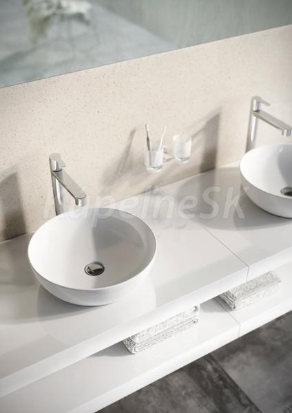 doplnky k dokúpeniu: doska pod umývadlo / skrinka pod umývadlo na dosku, umývadlová pileta pevná, keramická pileta Flat, sifón chrómový alebo nábytkový, extra predĺžené batérie Chrome II, 10°, Puri, Espirit alebo Eleganta