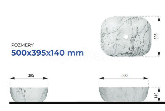 Obdĺžnikové keramické umývadlo s povrchovou štruktúrou mramoru a oblými rohmi, bez otvoru pre batériu