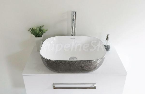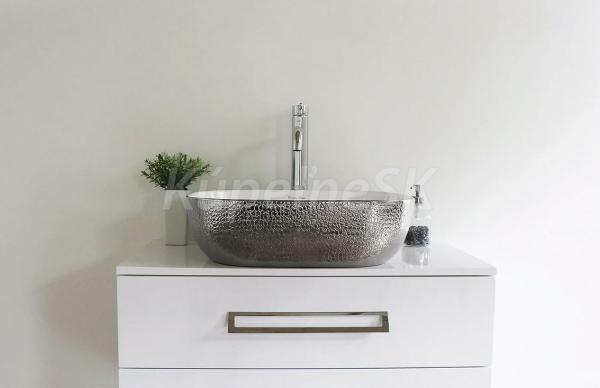 Obdĺžnikové keramické umývadlo s oblými rohmi, povrch štruktúra krokodíliej kože v striebornom odtieni bez otvoru pre batériu.