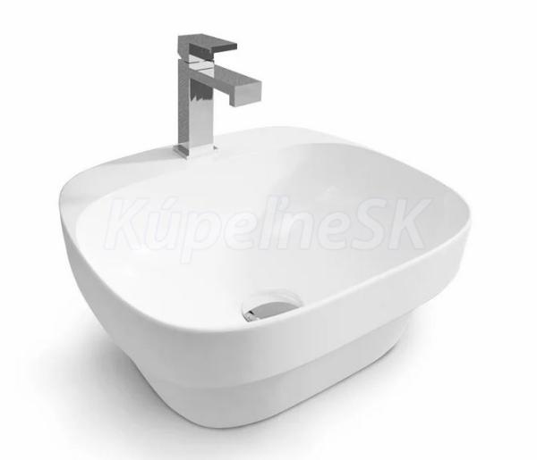 Štvorcové keramické umývadlo so zaoblenými rohmi a otvorom pre batériu, bez prepadu.