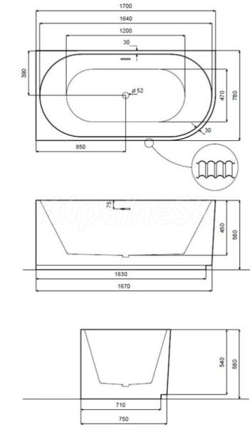 - 170 × 78 x 58 cm, objem 260 l, hmotnosť prázdnej vane 56 kg
