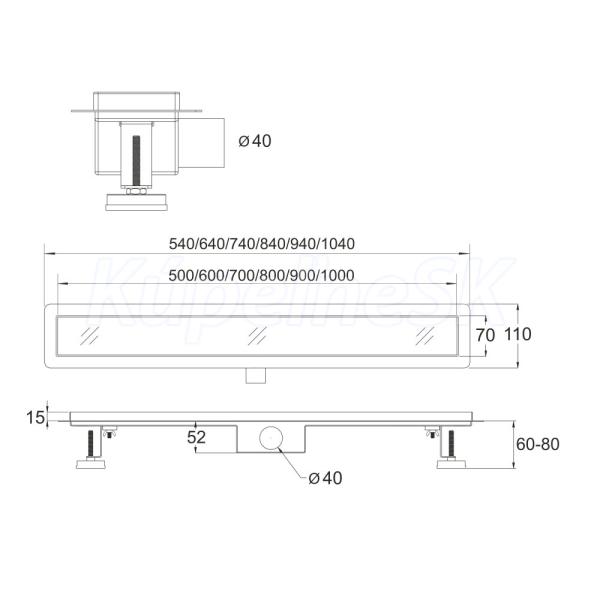 Odtokový sprchový žľab, 50x7 cm, nerez, vr. roštu TILE a nerezového vnútra sifónu.