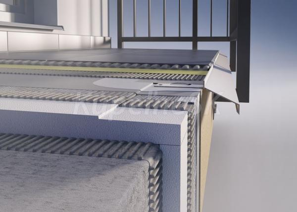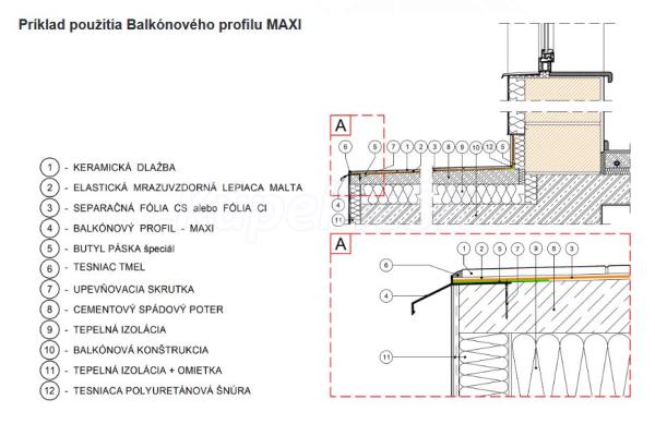 Balkónový profil MAXI – je ukončovací profil s okapničkou presahu 40 mm pre pokládku na hotový spádový poter, ktorý slúži na odtok vody z balkónov a terás. Výška ukončovacej hrany je 8 mm . Pomocou uzatvorenej hrany získame čisté a dokonalé ukončenie dlažby .Na profile je možnosť skrátenia ukončovacej hrany na výšku 1,3 mm. Je vhodný pre konštrukčné skladby s jedno alebo dvoj zložkovou elastickou hydroizoláciou prípadne separačnou fóliou CS.