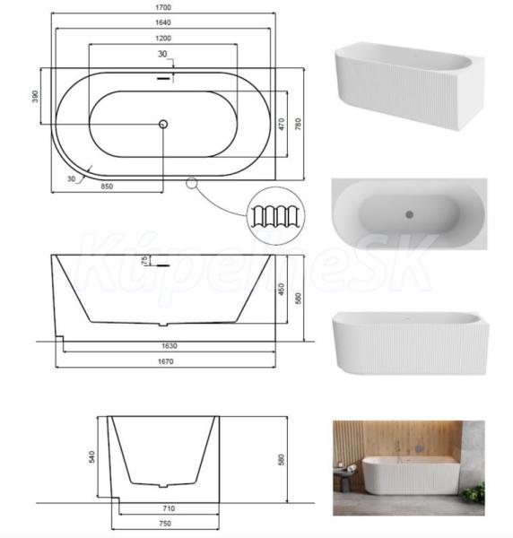 - 170 × 78 x 58 cm, objem 260 l, hmotnosť prázdnej vane 56 kg