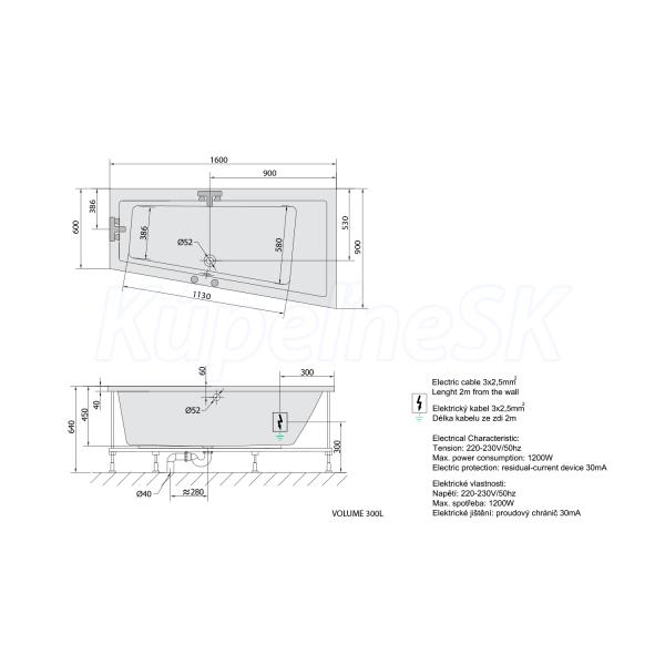 Polysan ANDRA R asym hydromasážna vaňa,160x90x45cm,Attraction Hydro-Air,Biela,krytka Chróm