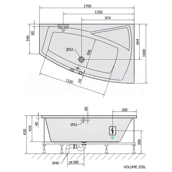 Polysan EVIA R hydromasážna vaňa, 170x100x47cm, Attraction Hydro, Biela,krytka Chróm